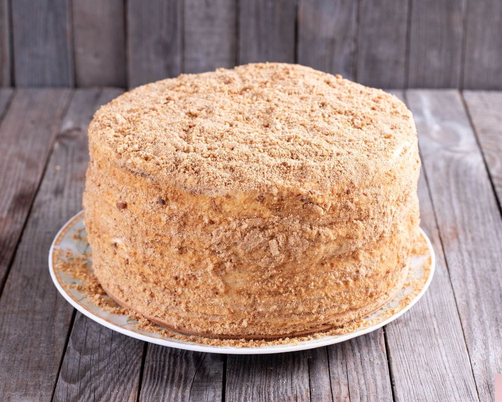 Miodownik to doskonały wybór dla miłośników tradycyjnych przysmaków o autentycznym smaku. Składa się z cienkich warstw ręcznie wyrabianego, delikatnego ciasta miodowego, przekładanego umiarkowanie słodkim, śmietankowym kremem z dodatkiem odrobiny soku z cytryny który przełamuje słodycz miodu, nadając ciastu idealną równowagę smaków.